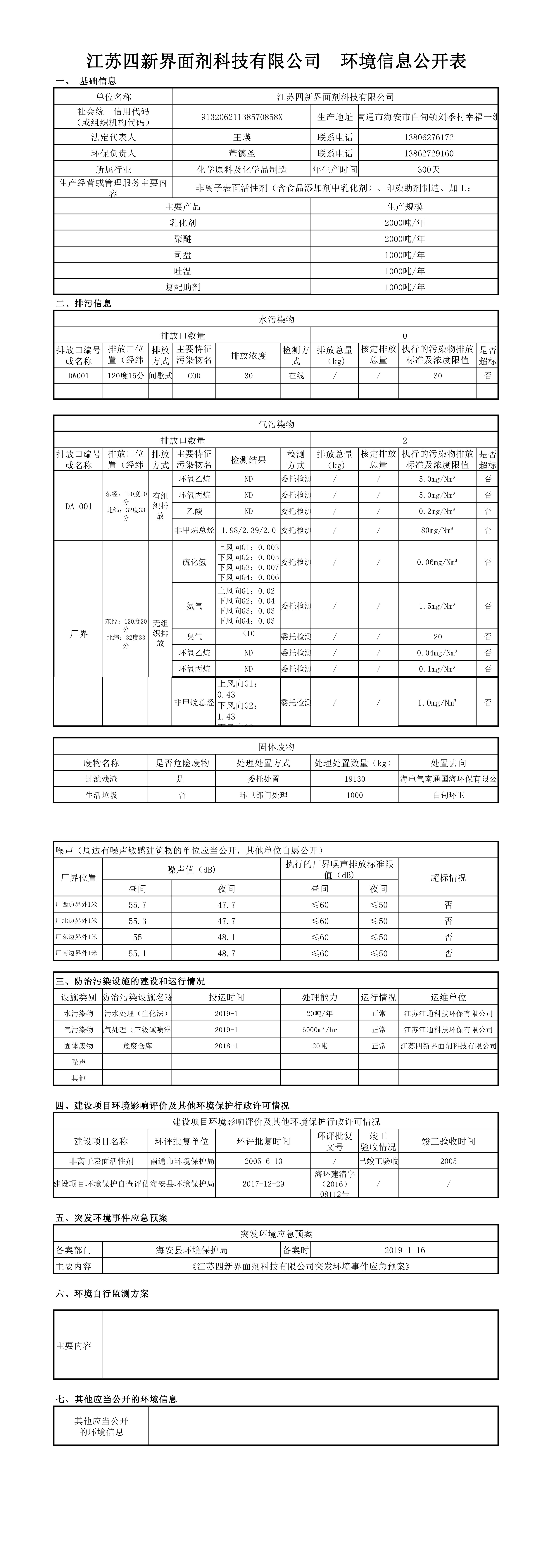 江蘇四新界面劑科技有限公司 環境信息公開表2019年5月